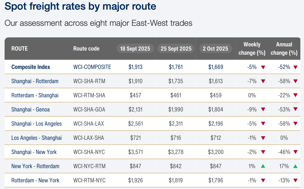 Here’s a chart of the rates broken out by major route. Shanghai to LA route - a common one for US-baed DTC/retail importers, is down 58% this year.