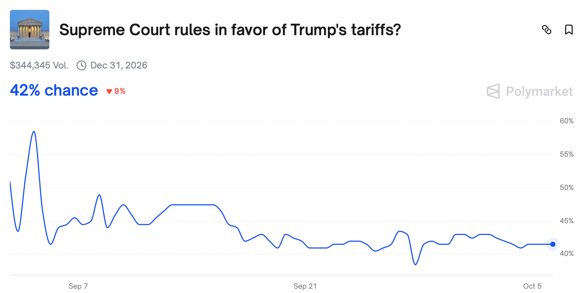 The Polymarket betting odds of Supreme Court ruling in favor of Trump's tariffs that I’ve been citing here remains steady at 42% (i.e. there’s a 58% chance Trump’s tariffs will be overturned).
