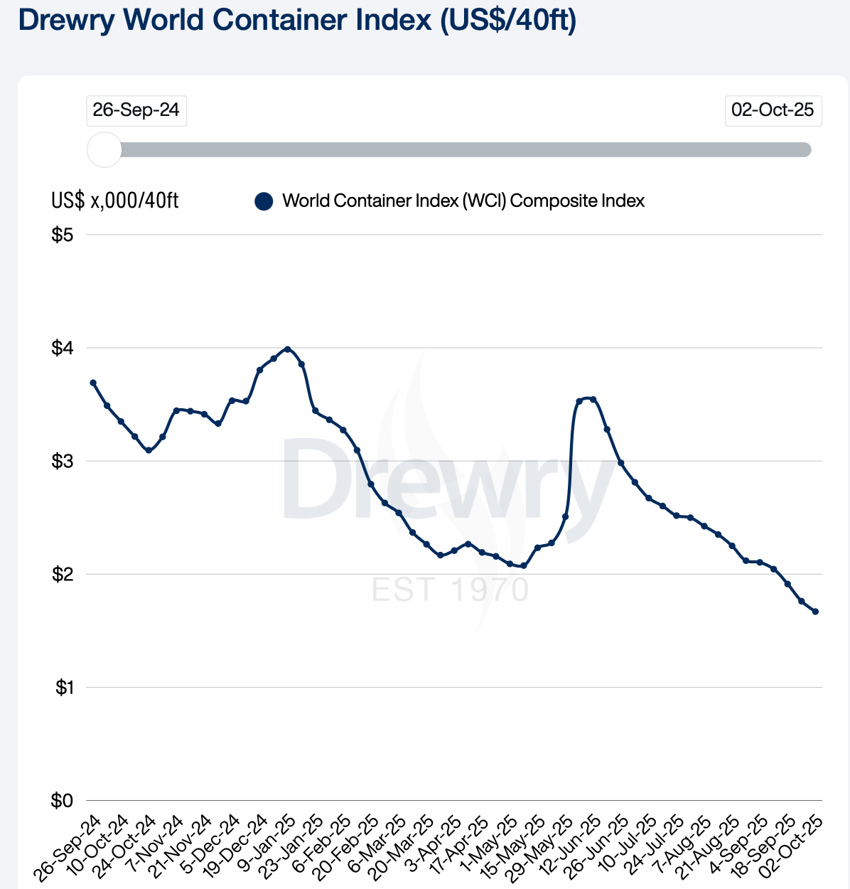 Haven’t shown container rate data in a few weeks so here’s an update on costs of containers across the Drewry World Container Index (a composite of the most common lane), showing a precipitous decline since the summer when inventory was being rushed in ahead of new tariff policy.