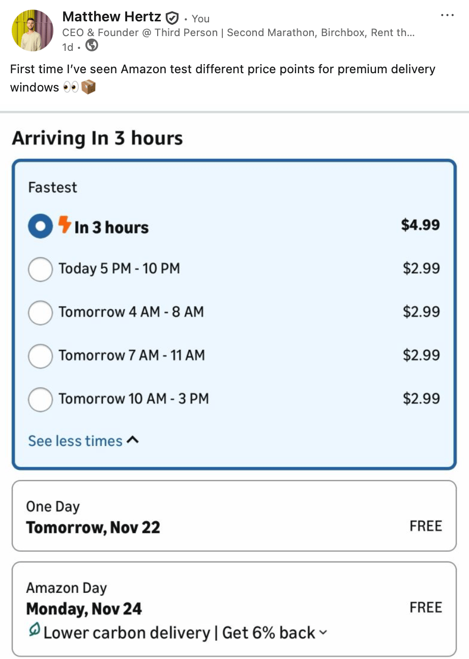Speaking of things arriving, I was placing an order on Amazon Friday afternoon and was fed this dynamic delivery time test. First time I had been presented with delivery options at different price ranges with Amazon.