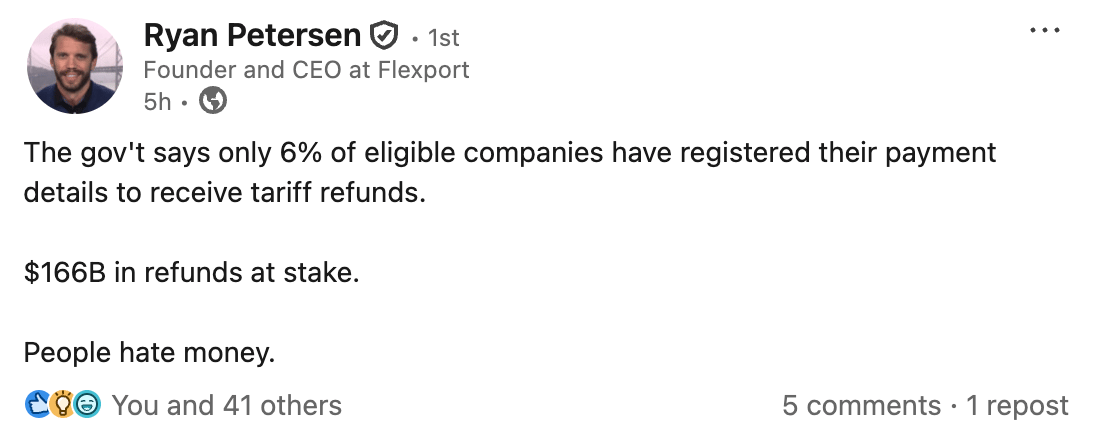The $166B Tariff Bounty: "People Hate Money" After weeks of chaos following the Supreme Court's ruling to strike down the IEEPA tariffs, Supply Chain Dive reports that Customs and Border Protection (CBP) is finally making progress on establishing the refund mechanisms. But the real story is how few brands are actually taking action. Flexport CEO Ryan Petersen pointed out on LinkedIn this week that the government says only 6% of eligible companies have registered their payment details to receive tariff refunds. With $166B in refunds at stake, Petersen summed it up perfectly: "People hate money." Call your customs broker immediately and get registered. Source: Supply Chain Dive